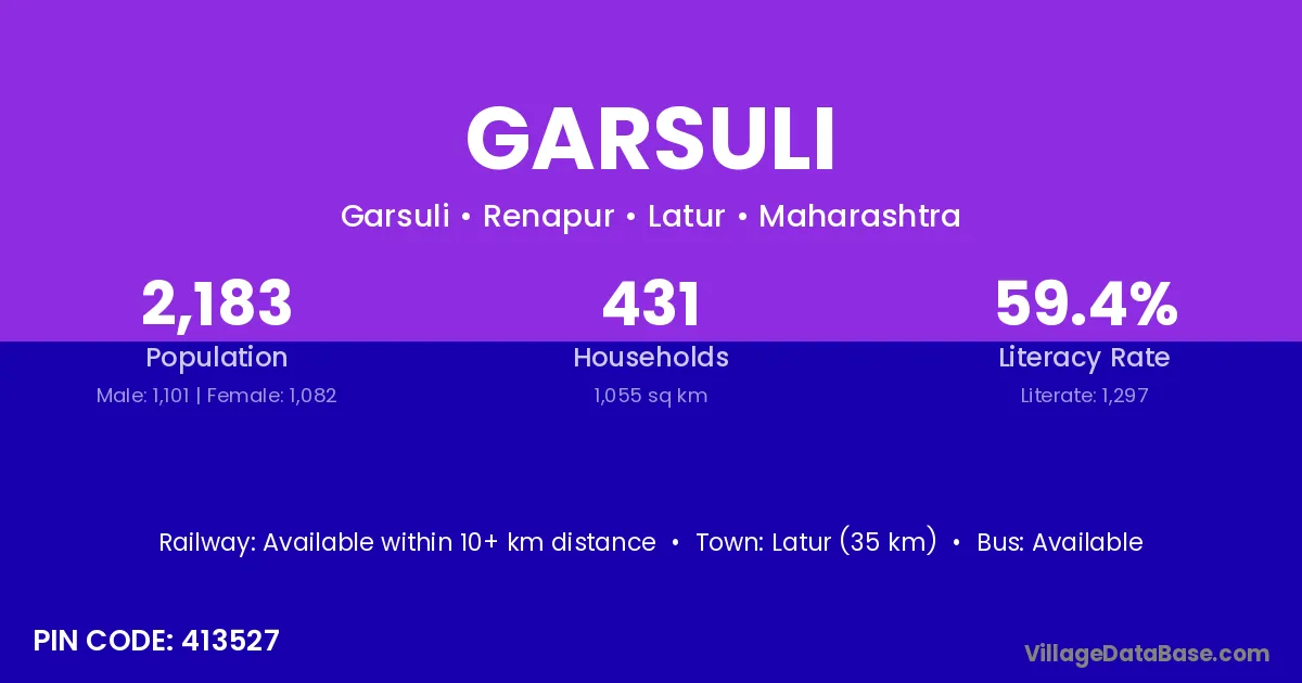 Latur (35 km) is the nearest town to Garsuli village for major economic activities and is located approximately 35 km away.