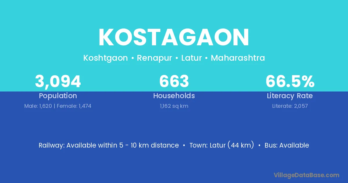 Latur (44 km) is the nearest town to Kostagaon village for major economic activities and is located approximately 44 km away.