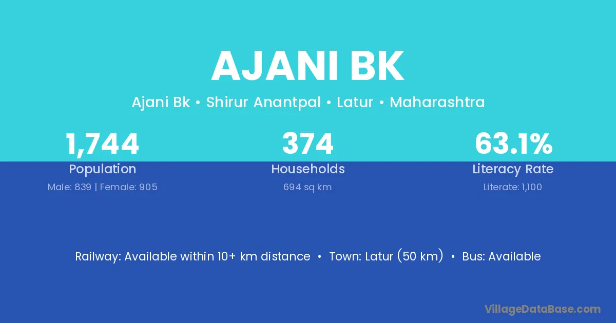 Latur (50 km) is the nearest town to Ajani Bk village for major economic activities and is located approximately 50 km away.