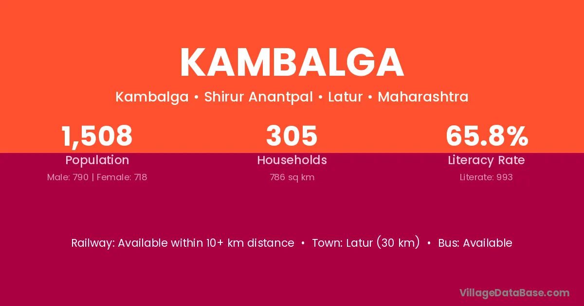 Latur (30 km) is the nearest town to Kambalga village for major economic activities and is located approximately 30 km away.