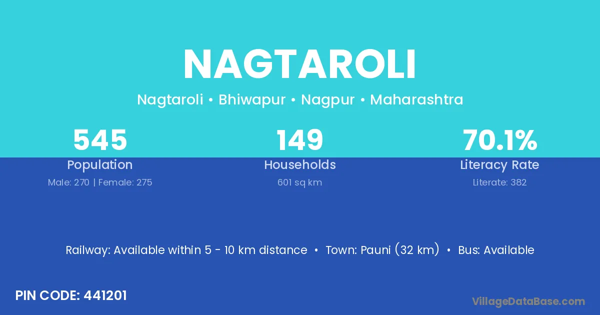 Pauni (32 km) is the nearest town to Nagtaroli village for major economic activities and is located approximately 32 km away.