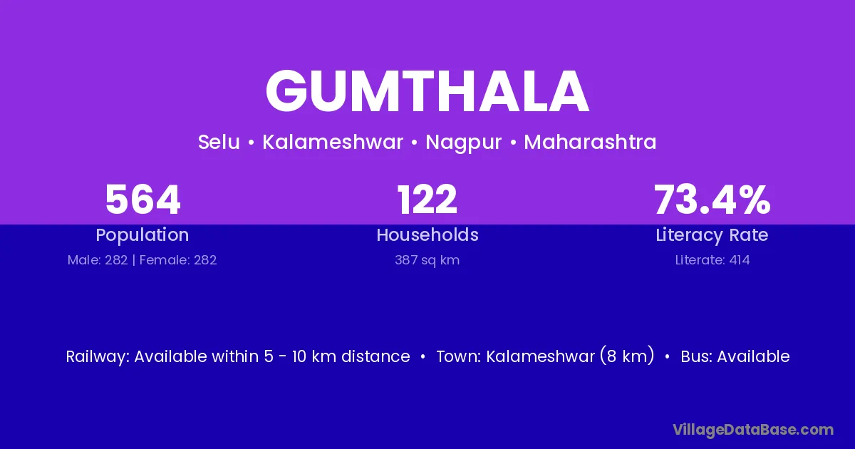 Kalameshwar (8 km) is the nearest town to Gumthala village for major economic activities and is located approximately 8 km away.