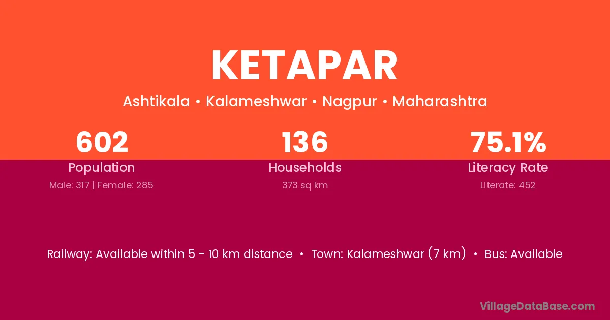 Kalameshwar (7 km) is the nearest town to Ketapar village for major economic activities and is located approximately 7 km away.