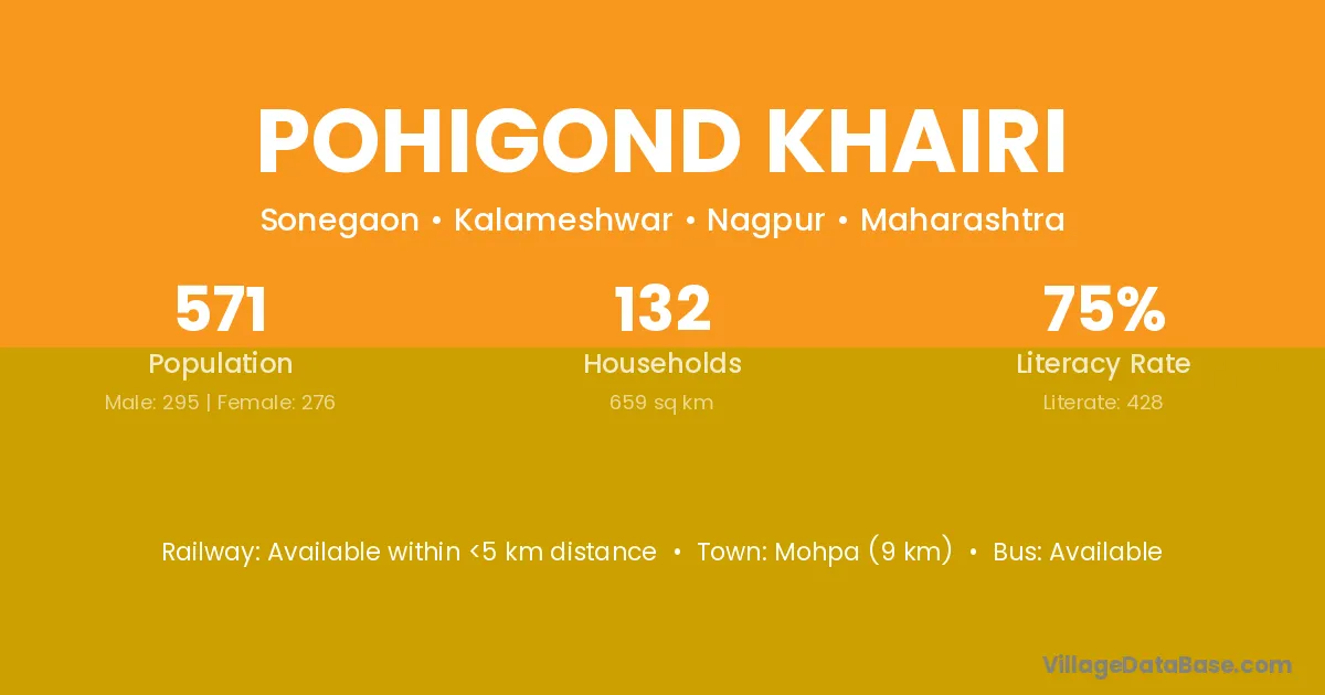 Mohpa (9 km) is the nearest town to Pohigond Khairi village for major economic activities and is located approximately 9 km away.