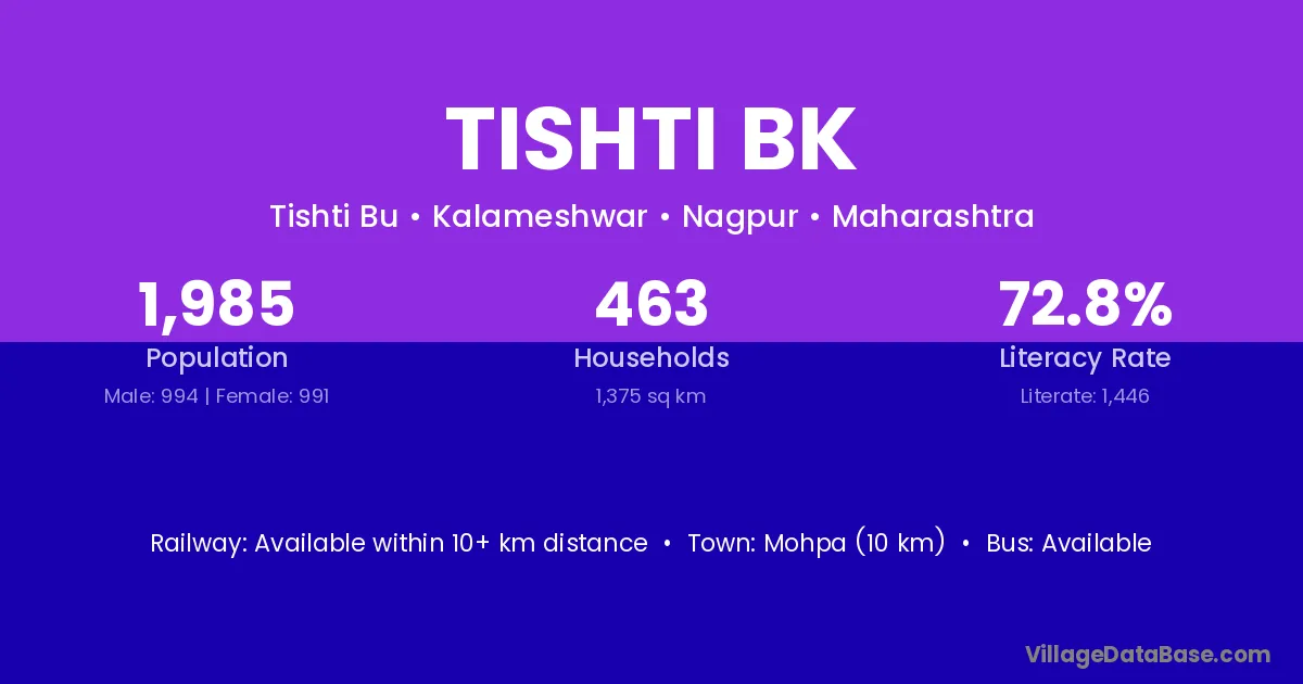 Tishti Bk village has a total population of 1,985 people, of which 994 are males and 991 are females.