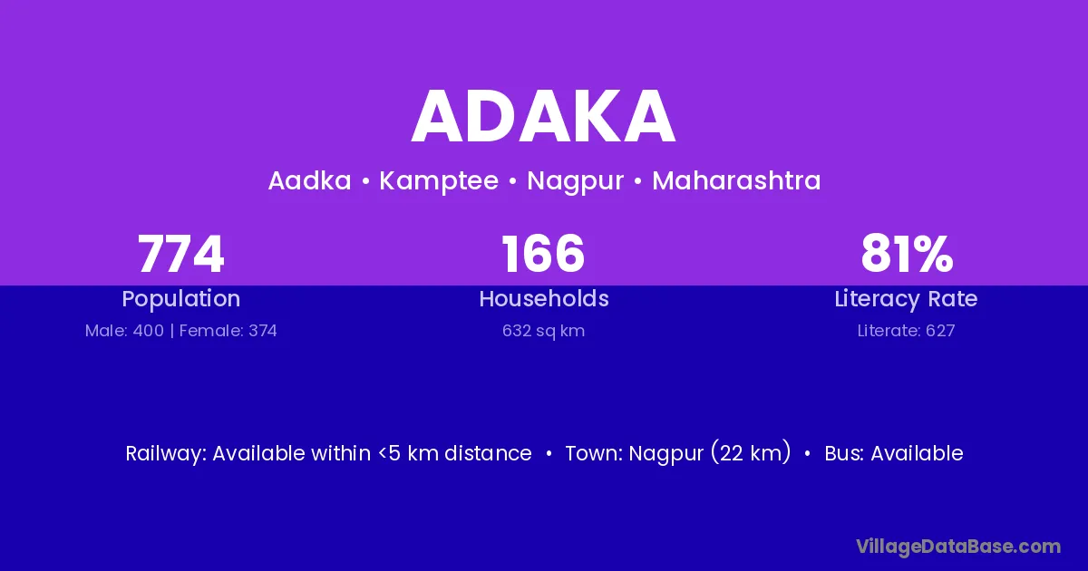 Nagpur (22 km) is the nearest town to Adaka village for major economic activities and is located approximately 22 km away.