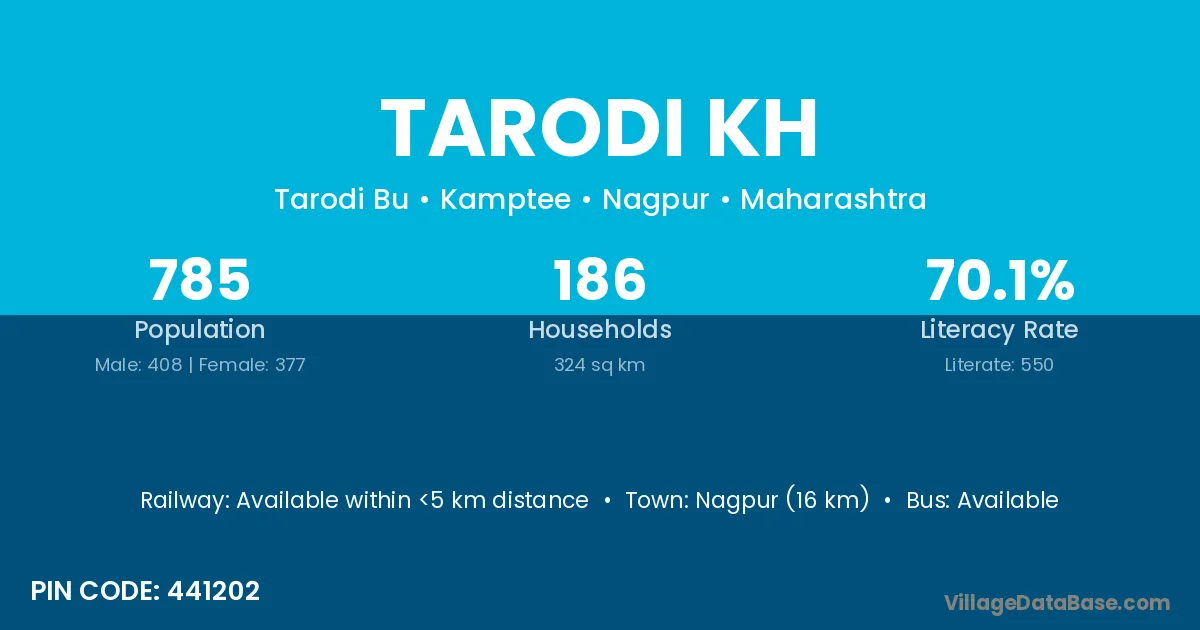 Nagpur (16 km) is the nearest town to Tarodi Kh village for major economic activities and is located approximately 16 km away.