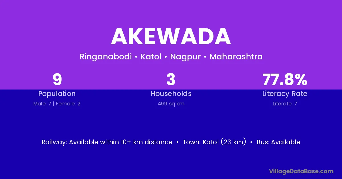 Katol (23 km) is the nearest town to Akewada village for major economic activities and is located approximately 23 km away.