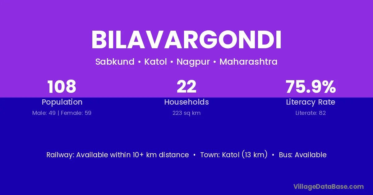 Katol (13 km) is the nearest town to Bilavargondi village for major economic activities and is located approximately 13 km away.