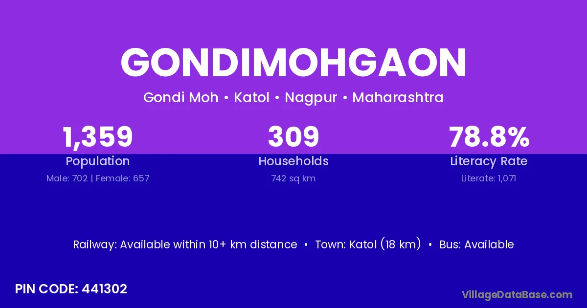 Katol (18 km) is the nearest town to Gondimohgaon village for major economic activities and is located approximately 18 km away.