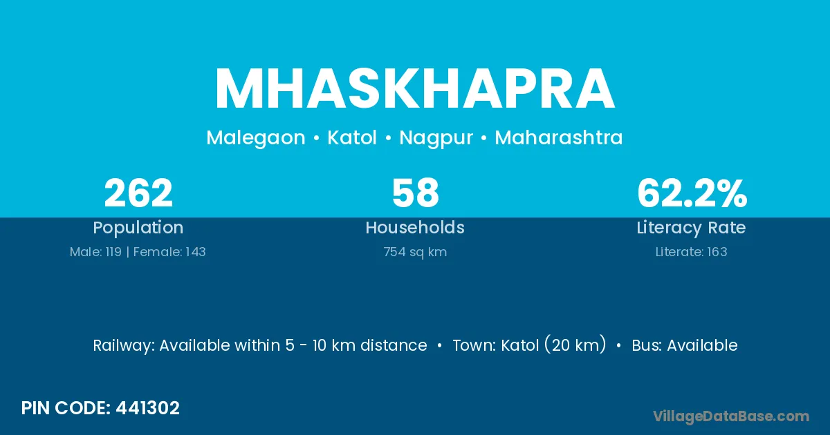 Katol (20 km) is the nearest town to Mhaskhapra village for major economic activities and is located approximately 20 km away.