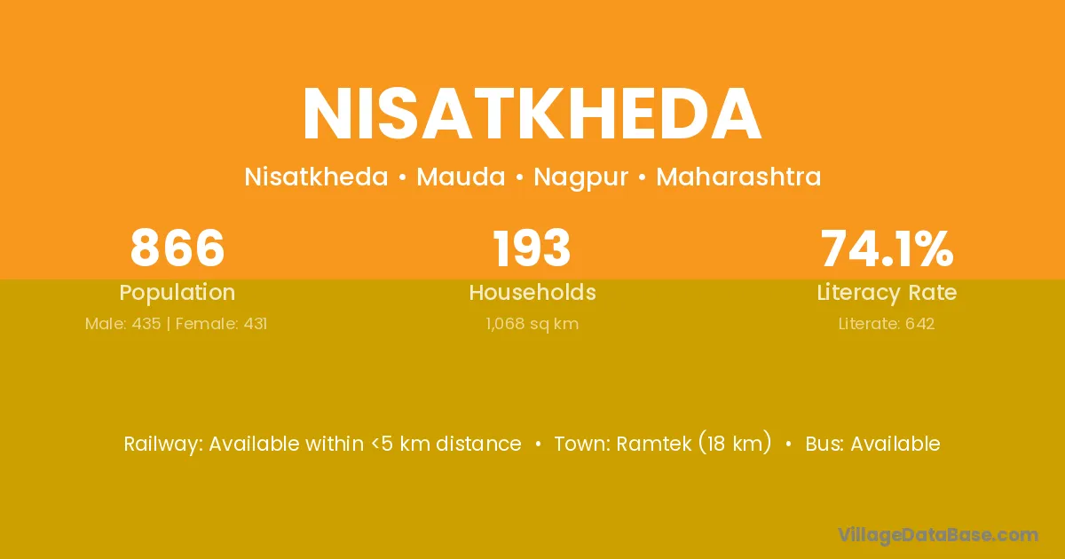 Ramtek (18 km) is the nearest town to Nisatkheda village for major economic activities and is located approximately 18 km away.