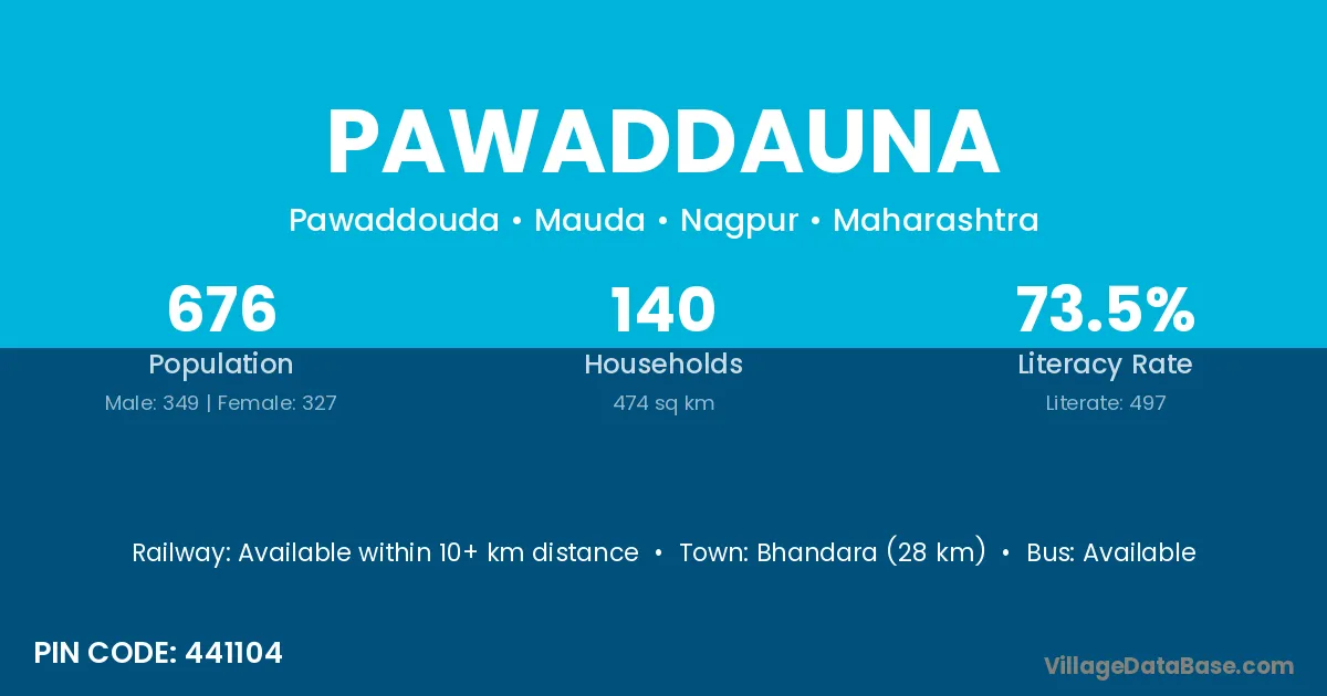 Bhandara (28 km) is the nearest town to Pawaddauna village for major economic activities and is located approximately 28 km away.