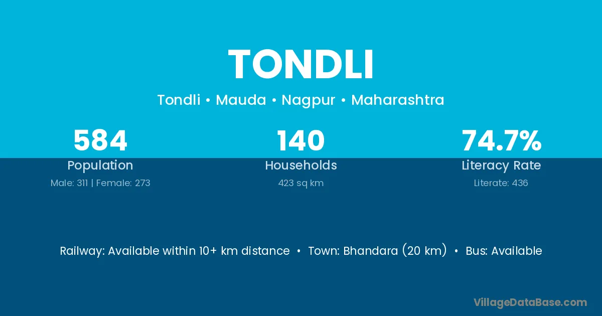 Bhandara (20 km) is the nearest town to Tondli village for major economic activities and is located approximately 20 km away.