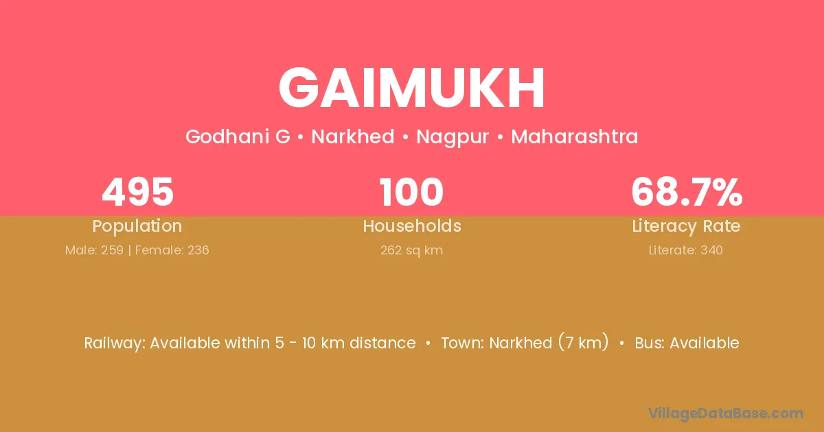 Narkhed (7 km) is the nearest town to Gaimukh village for major economic activities and is located approximately 7 km away.