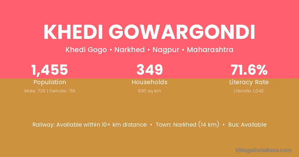 Narkhed (14 km) is the nearest town to Khedi Gowargondi village for major economic activities and is located approximately 14 km away.