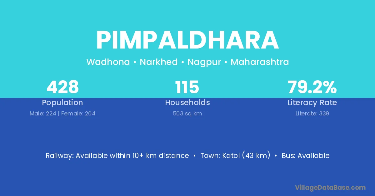 Katol (43 km) is the nearest town to Pimpaldhara village for major economic activities and is located approximately 43 km away.