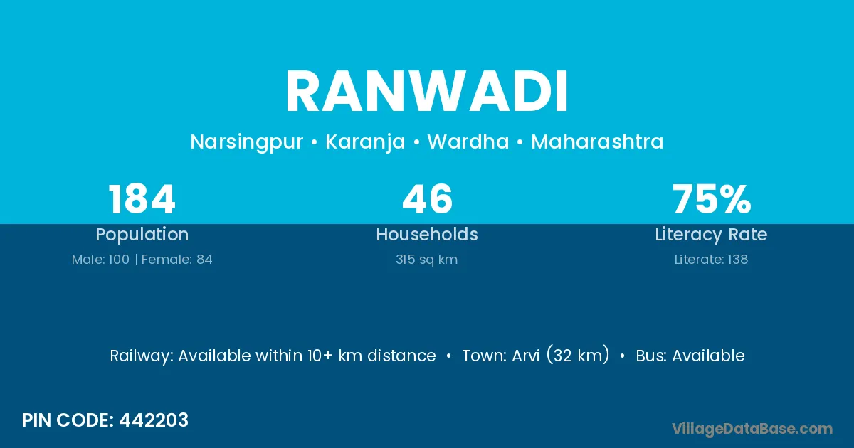 Katol (22 km) is the nearest town to Ranwadi village for major economic activities and is located approximately 22 km away.