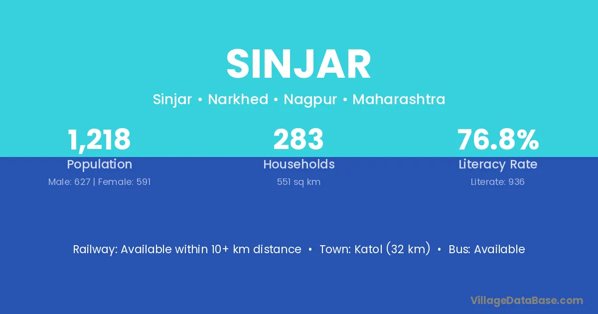 Katol (32 km) is the nearest town to Sinjar village for major economic activities and is located approximately 32 km away.