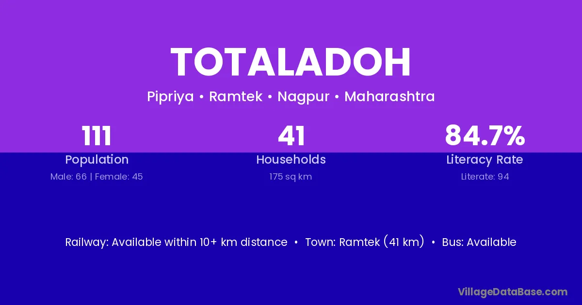 Ramtek (41 km) is the nearest town to Totaladoh village for major economic activities and is located approximately 41 km away.