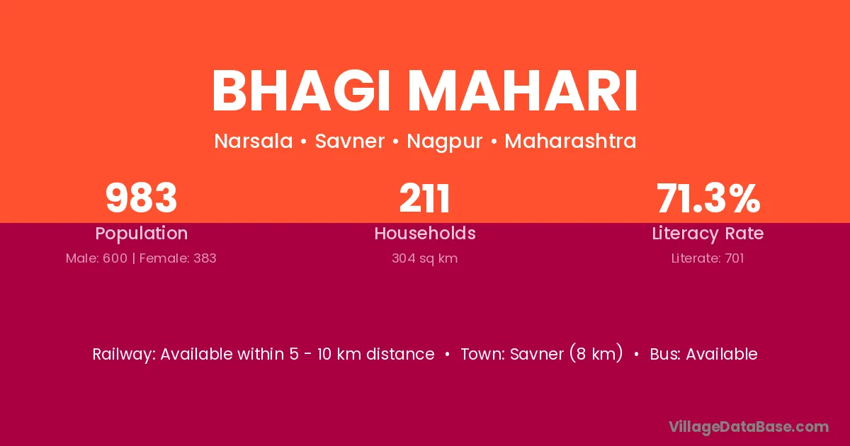 Savner (8 km) is the nearest town to Bhagi Mahari village for major economic activities and is located approximately 8 km away.