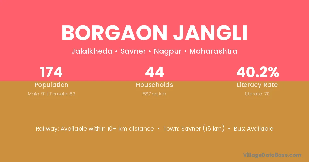 Borgaon Jangli village has a total population of 174 people, of which 91 are males and 83 are females.