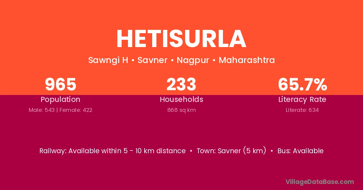Savner (5 km) is the nearest town to Hetisurla village for major economic activities and is located approximately 5 km away.