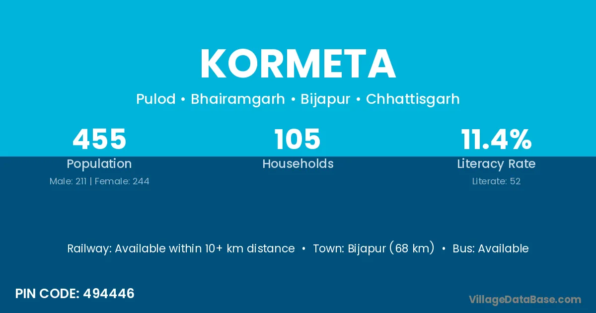 Khapa (22 km) is the nearest town to Kormeta village for major economic activities and is located approximately 22 km away.
