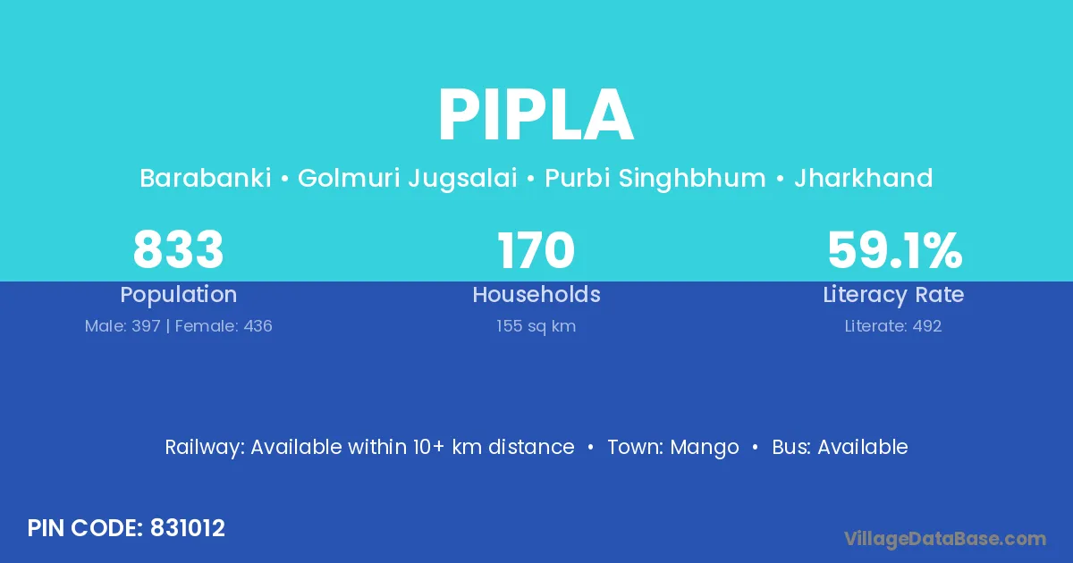 The literacy rate of Pipla village is 57.89%. Male literacy stands at 100.00% and female literacy at 33.33%.