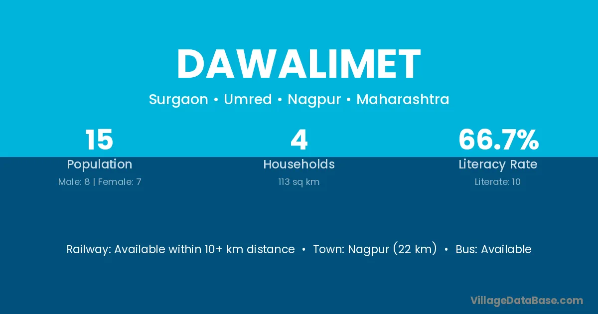 Nagpur (22 km) is the nearest town to Dawalimet village for major economic activities and is located approximately 22 km away.
