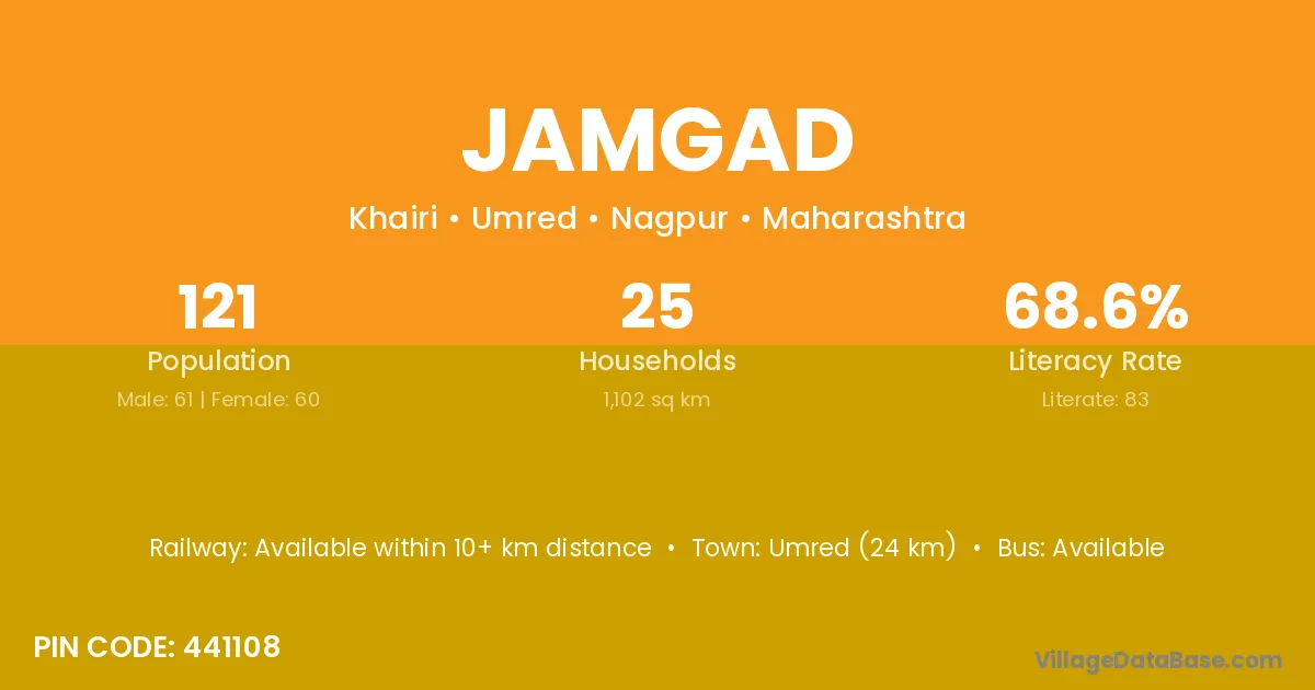 Umred (24 km) is the nearest town to Jamgad village for major economic activities and is located approximately 24 km away.