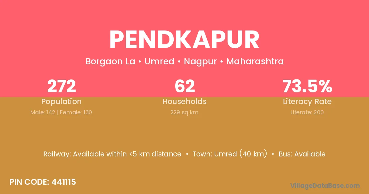 Umred (40 km) is the nearest town to Pendkapur village for major economic activities and is located approximately 40 km away.