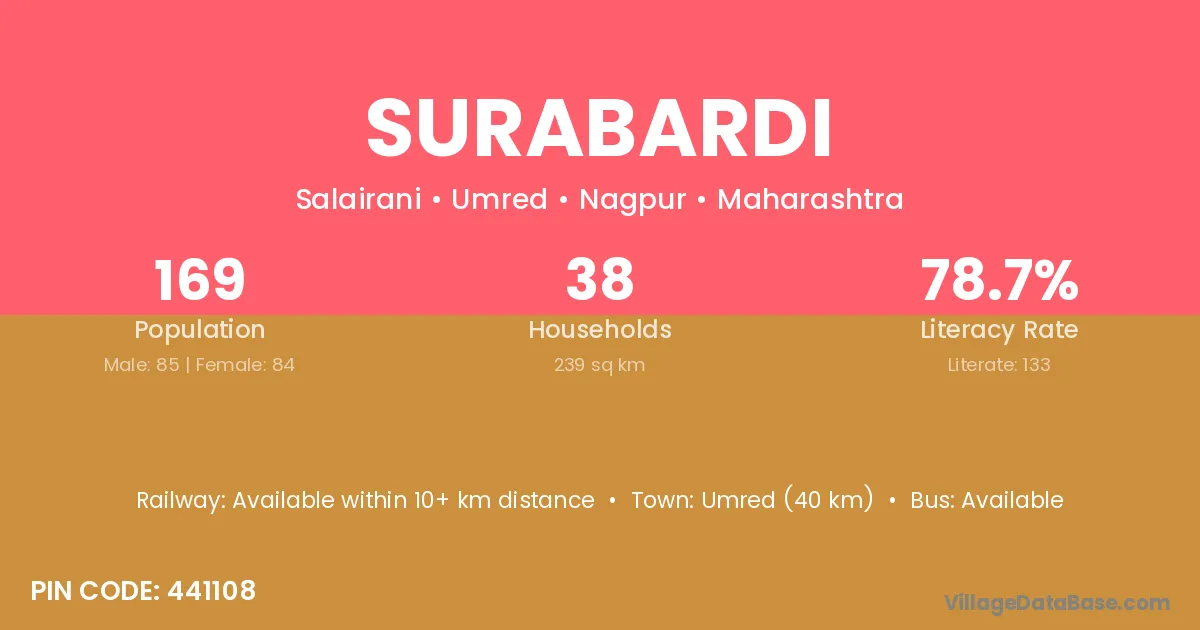 Umred (40 km) is the nearest town to Surabardi village for major economic activities and is located approximately 40 km away.