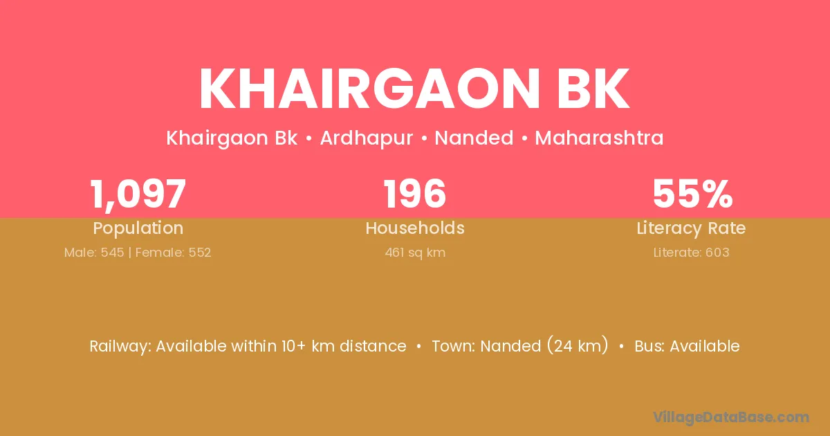 Nanded (24 km) is the nearest town to Khairgaon Bk village for major economic activities and is located approximately 24 km away.