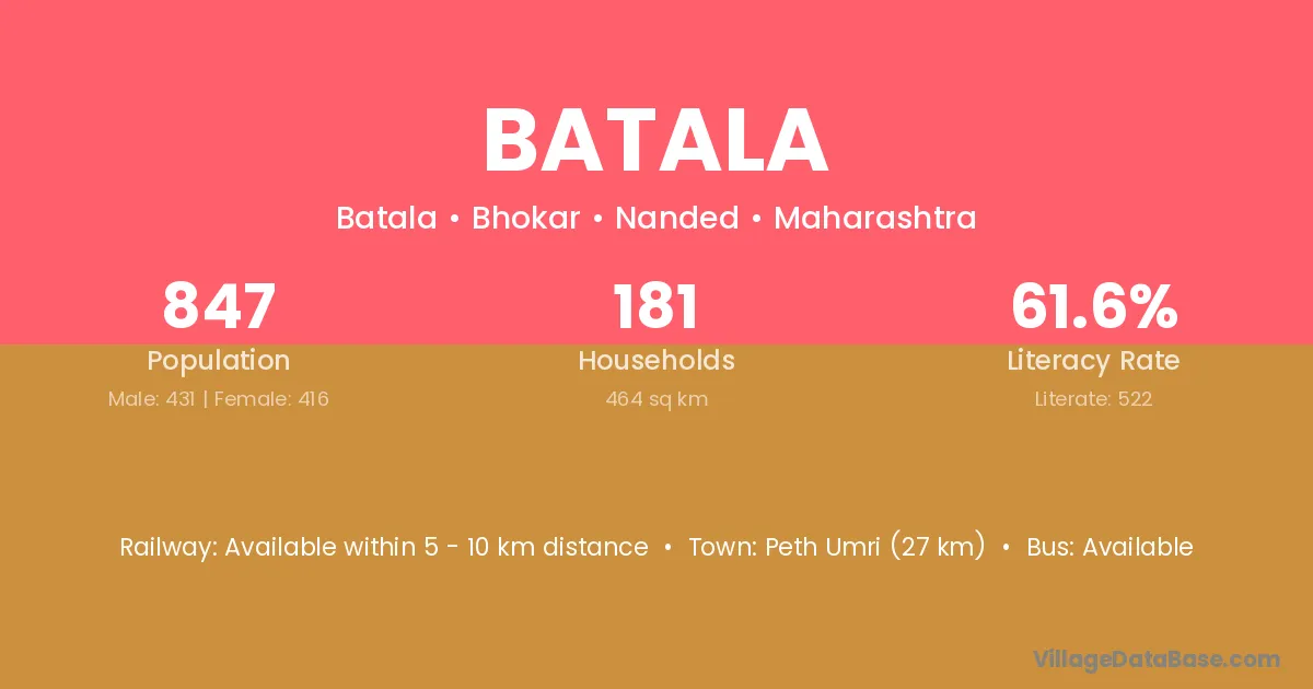 Peth Umri (27 km) is the nearest town to Batala village for major economic activities and is located approximately 27 km away.