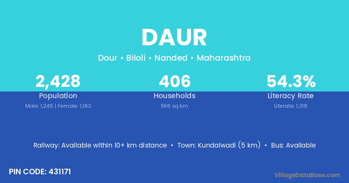 Peth Umri (10 km) is the nearest town to Daur village for major economic activities and is located approximately 10 km away.