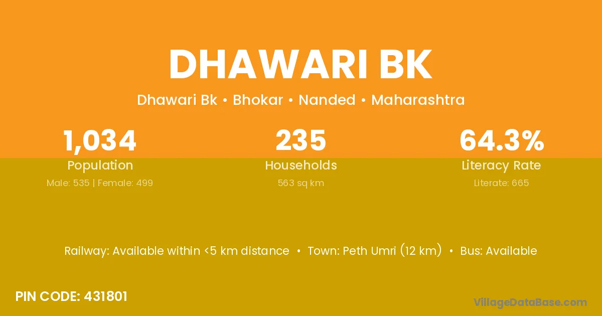 Peth Umri (12 km) is the nearest town to Dhawari Bk village for major economic activities and is located approximately 12 km away.