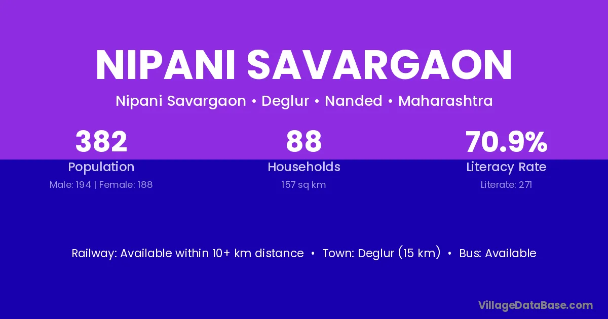 Deglur (15 km) is the nearest town to Nipani Savargaon village for major economic activities and is located approximately 15 km away.