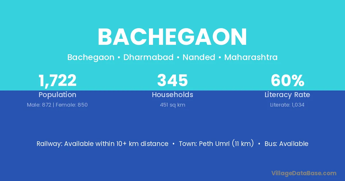 Peth Umri (11 km) is the nearest town to Bachegaon village for major economic activities and is located approximately 11 km away.