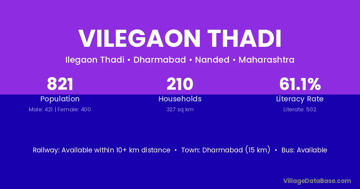 Dharmabad (15 km) is the nearest town to Vilegaon Thadi village for major economic activities and is located approximately 15 km away.