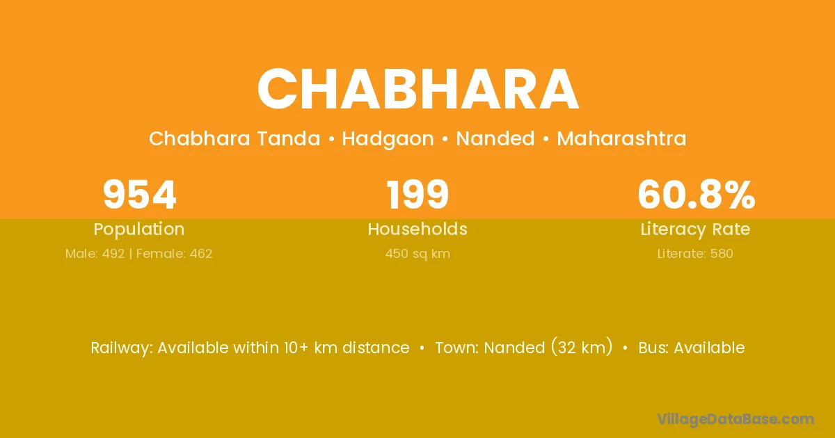 Nanded (32 km) is the nearest town to Chabhara village for major economic activities and is located approximately 32 km away.