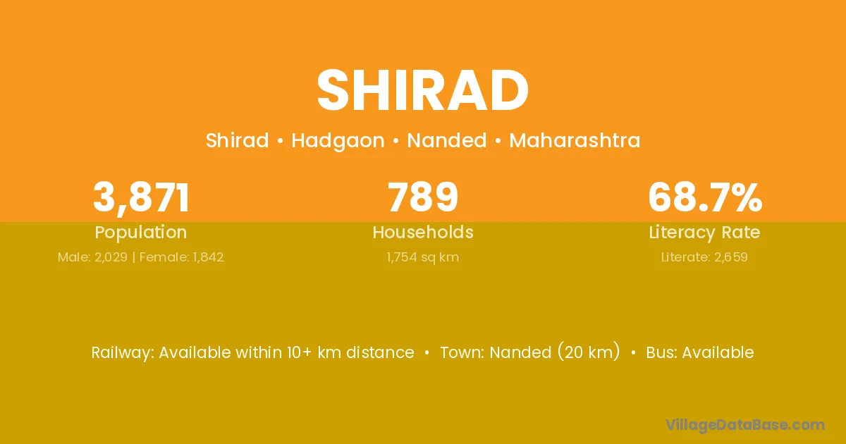 Nanded (20 km) is the nearest town to Shirad village for major economic activities and is located approximately 20 km away.