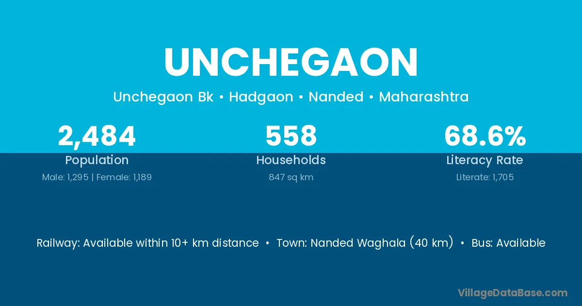 Nanded Waghala (40 km) is the nearest town to Unchegaon village for major economic activities and is located approximately 40 km away.