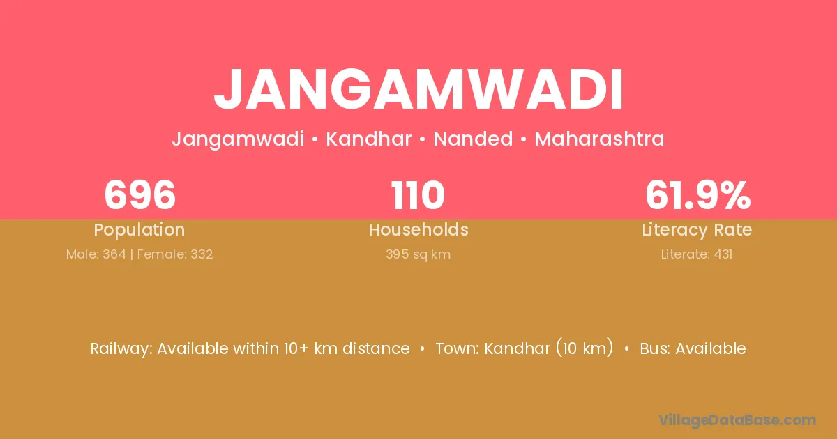 Jangamwadi village has a total population of 696 people, of which 364 are males and 332 are females.