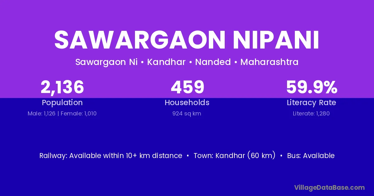Kandhar (60 km) is the nearest town to Sawargaon Nipani village for major economic activities and is located approximately 60 km away.