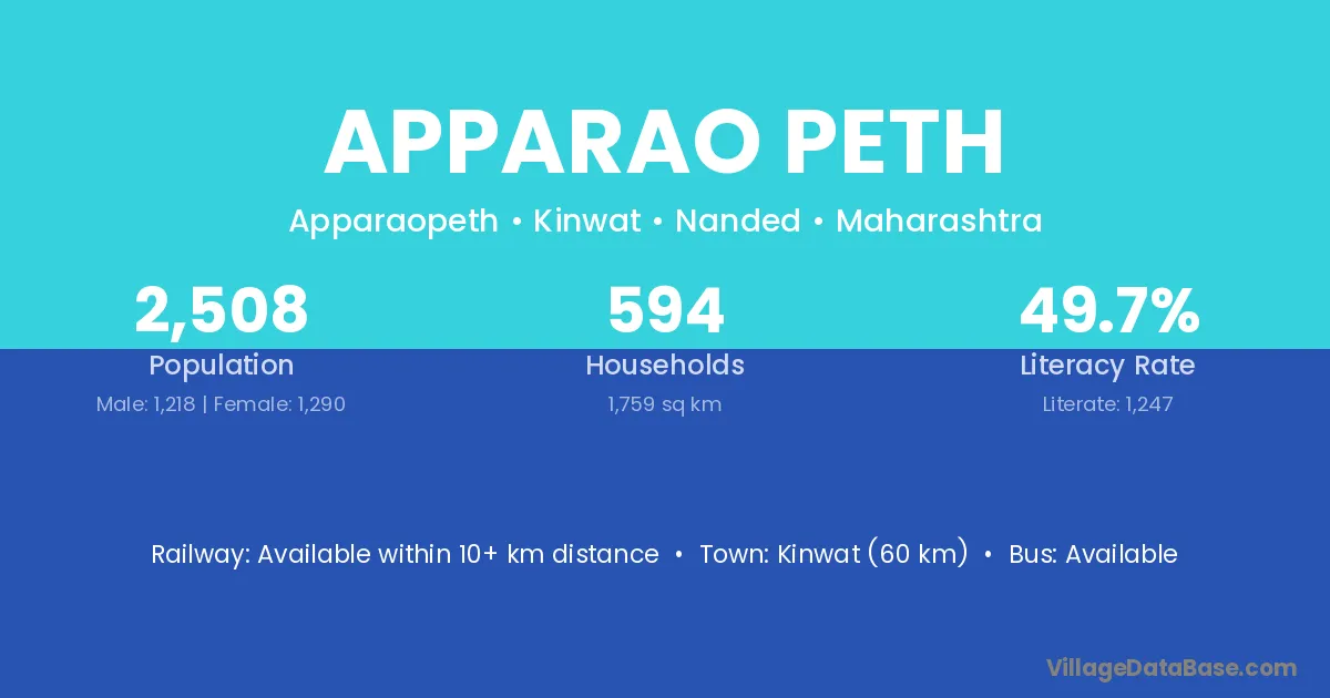 Apparao Peth village has a total population of 2,508 people, of which 1,218 are males and 1,290 are females.