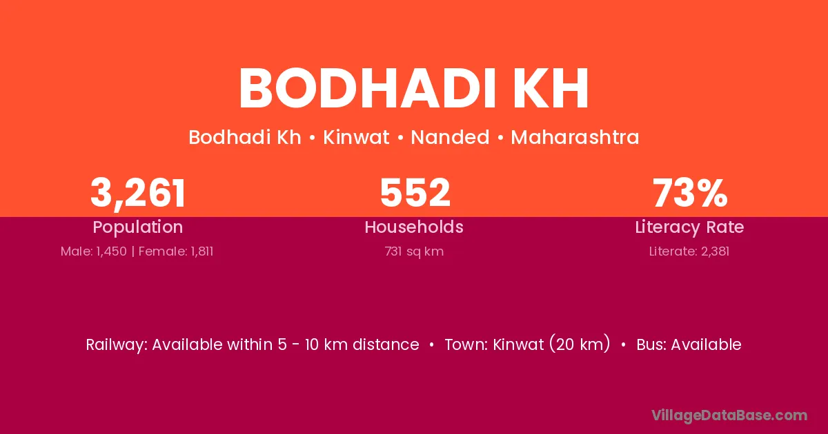 Kinwat (20 km) is the nearest town to Bodhadi Kh village for major economic activities and is located approximately 20 km away.