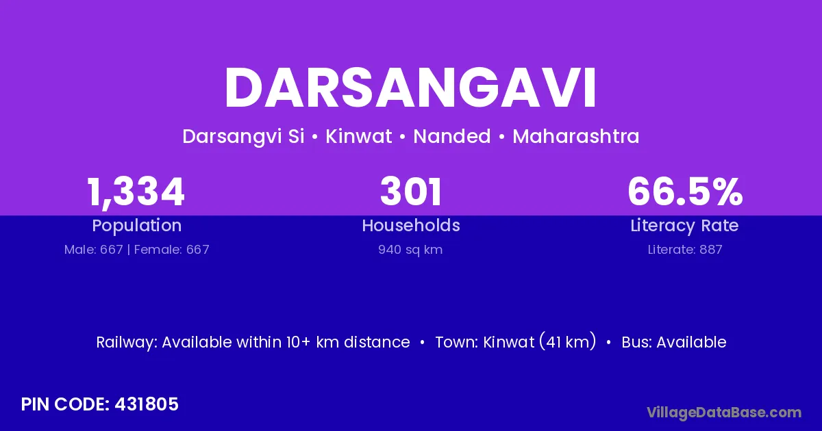 Kinwat (41 km) is the nearest town to Darsangavi village for major economic activities and is located approximately 41 km away.