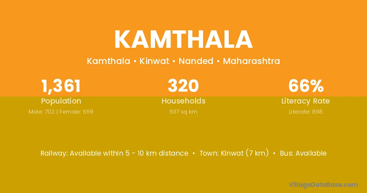 Kinwat (7 km) is the nearest town to Kamthala village for major economic activities and is located approximately 7 km away.