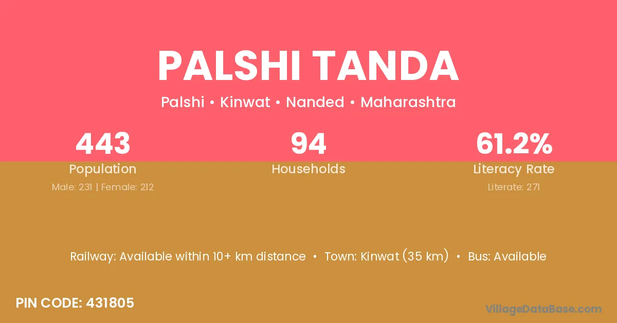Kinwat (35 km) is the nearest town to Palshi Tanda village for major economic activities and is located approximately 35 km away.